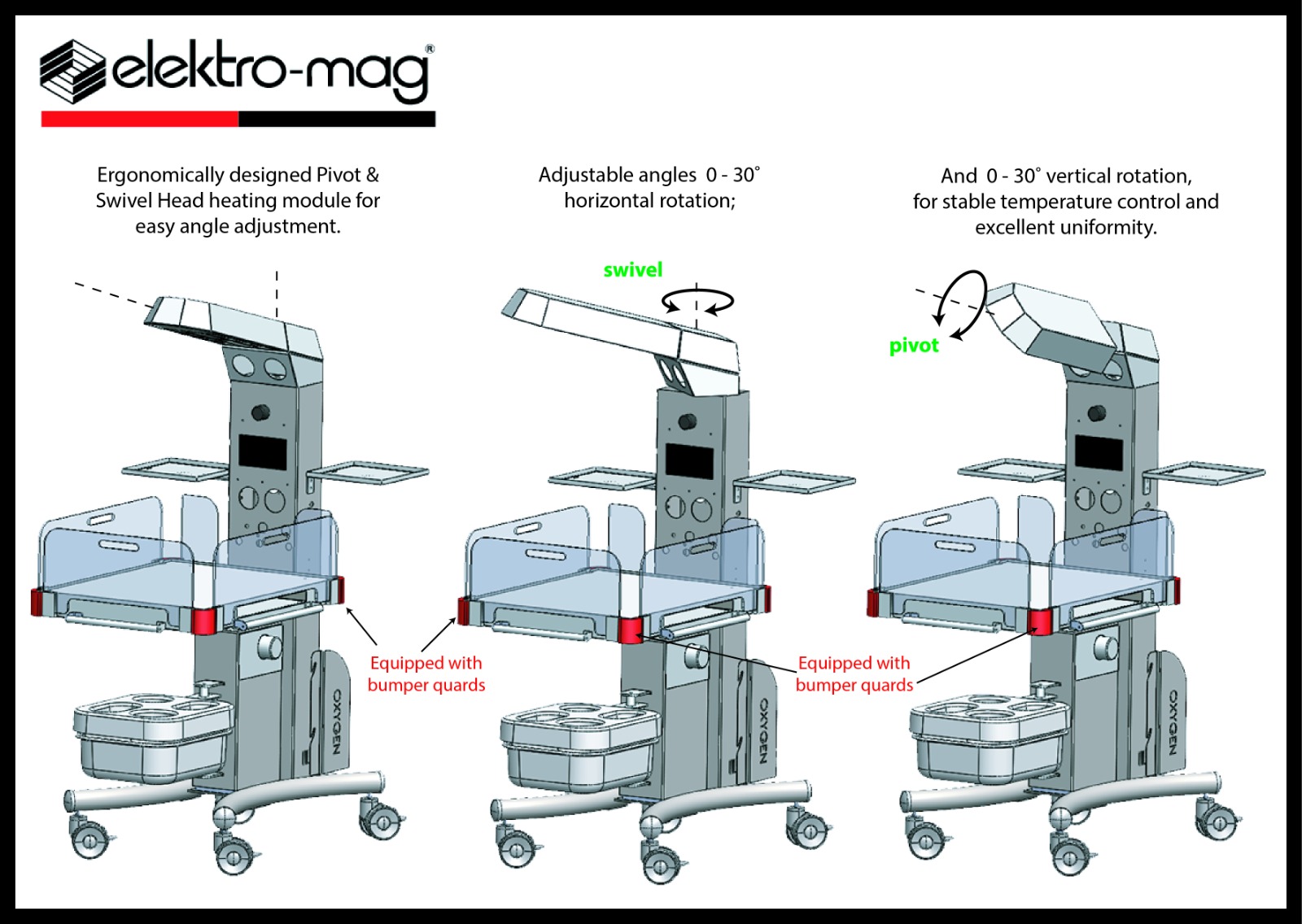Precise temperature control is provided with 7” touch color TFT screen and PID electronic heating system. There are options in the control unit that make it easier to follow the process and systems that give warnings when necessary. Flexible use is offered with a mobile heat unit and various operating modes. Elektro-mag M 308 newborn radiant heaters are equipped with the necessary safety systems and have high safety standards.